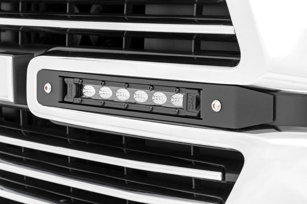 COMMAND THE DARK with Rough Country's 6in LED Grille Kit for 5th generation RAM 1500. This sleek, recessed LED kit fits into the two slots in the factory grille, providing the perfect location for forward-facing LED power. Rough Country's 6in LED Grille Kit fits in so well it looks like a factory upgrade! Despite the tiny size, this powerful, dual 6in LED setup provides a jaw-dropping 2,880 lumens of lighting power with a 90-degree flood beam, enough to light up the trail ahead and then some! Each LED features a die cast aluminum housing and IP67 waterproof rating, so it's sure to withstand the elements each and every time. Upgrade your RAM 1500 with Rough Country's 6in LED Grille Kit today and release your truck's true potential!